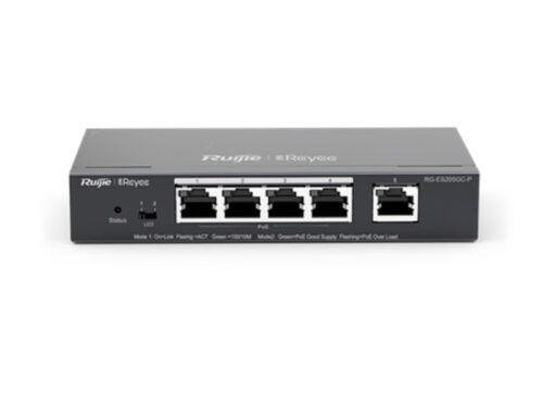 Ruijie Reyee RG-ES205GC-P - это 5-портовый гигабитный управляемый облаком смарт-коммутатор с поддержкой PoE. Коммутационная ёмкость 10 Гбит/с, PoE: 54 Вт, IEEE 802.3at / IEEE 802.3af, скорость пересылки: 7,44 млн пакетов/с
