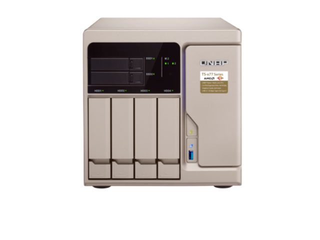 Сетевой накопитель QNAP TS-677-1600-8G, 4 отсека 3,5 / 2,5 дюйма, 2 отсека 2,5 дюйма, 2 слота M.2, настольный форм-фактор. Процессор AMD Ryzen 5 1600 6 ядер с частотой 3,2 ГГц, оперативная память DDR4 UDIMM 8 Гб с возможностью расширения до 64 Гб. Операционная система QTS.